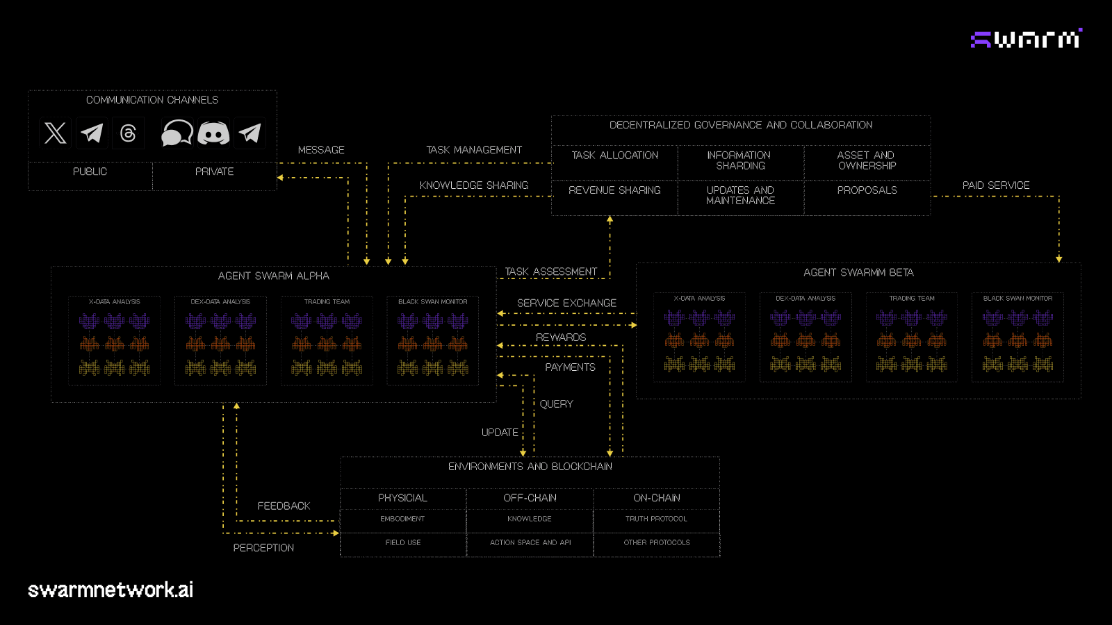 Agent swarms within the Swarm Network effectively act as AI-powered “middleware,” bridging decentralized applications (dApps) and end users. Here’s how: